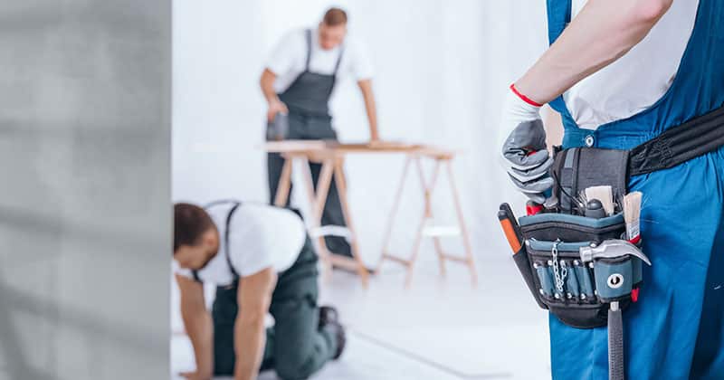 Close-up of handyman with glove on hand and tool belt on blue trousers during home renovation